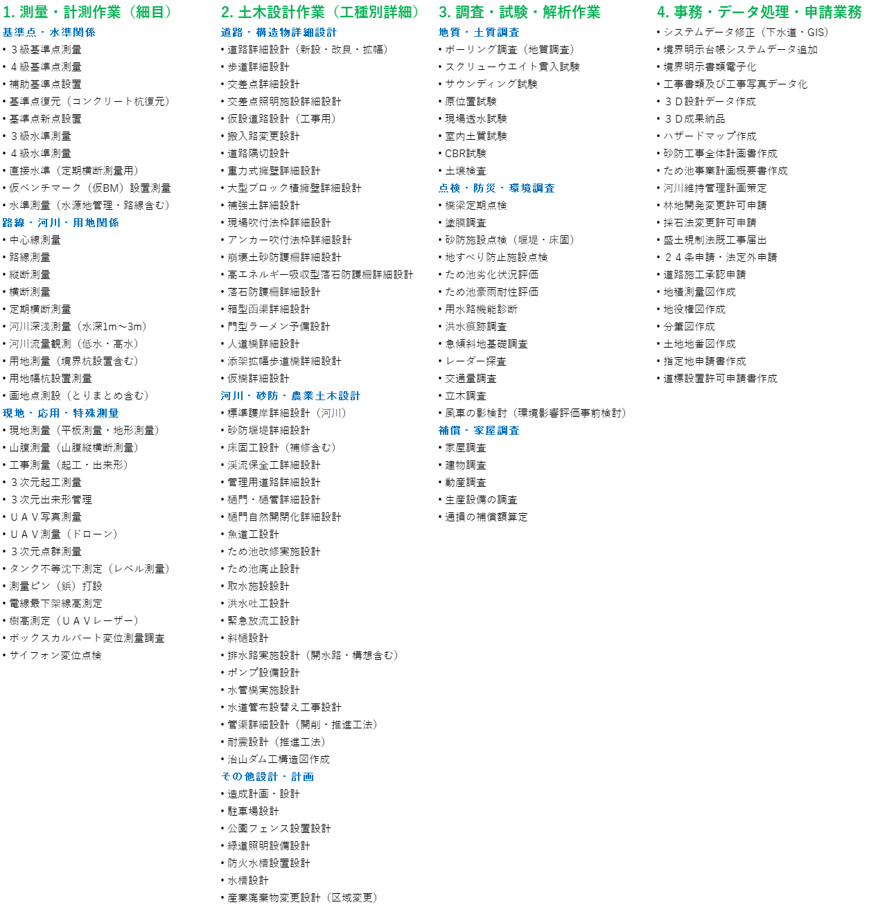 1. 主要業務カテゴリと価値:測量から点検、最新技術の活用までを分類。
